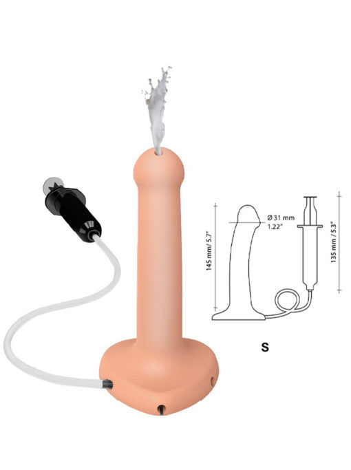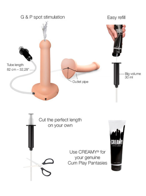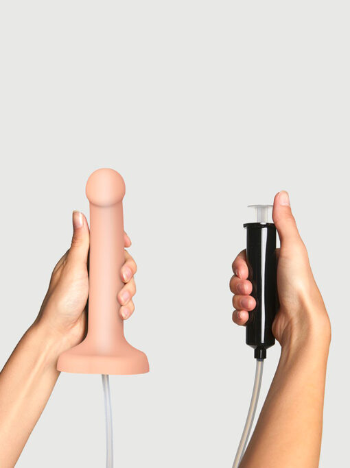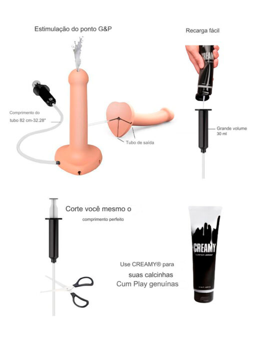 A função da ejaculação, para além de excitante, é bastante útil para reforçar a lubrificação interior sem ter de tirar o brinquedo e é também absolutamente fabuloso para quem gosta de sexo completamente encharcado em lubrificação, onde poderá injetar toda a lubrificação que quiser e observá-lo a escorrer para fora durante os seus movimentos mais fugazes!