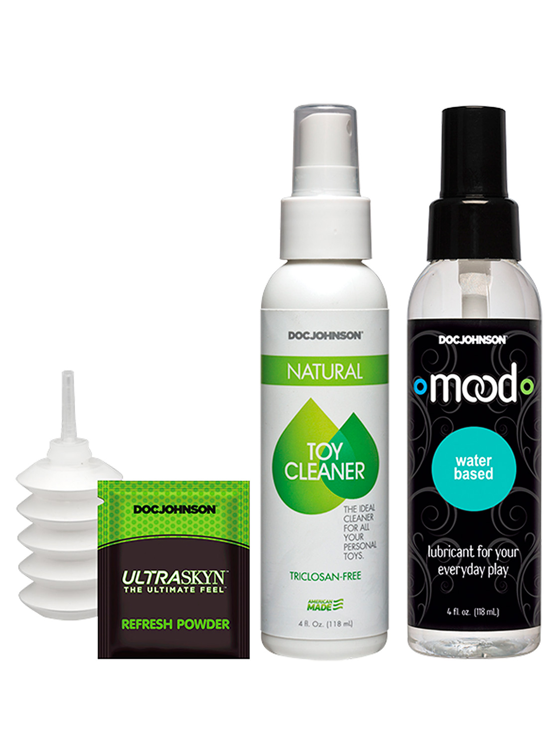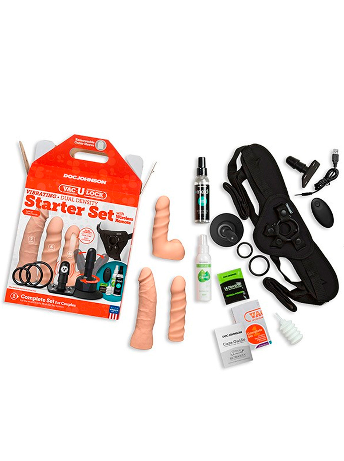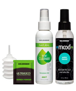Para completar, o Kit inclui um lubrificante à base de água que poderá ser utilizado para auxiliar tanto na penetração anal como vaginal, um spray de limpeza que deverá utilizar para desinfetar os seus brinquedos antes e após cada utilização, pó talco para ajudar a colocar os dildos nas peças de encaixe, e pó renovador que deverá aplicar após a limpeza, garantindo assim maior longevidade dos seus dildos de pele cibernética.