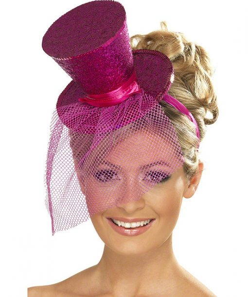 Mini chapéu rosa fuchsia com véu. Prende à cabeça com bandelete