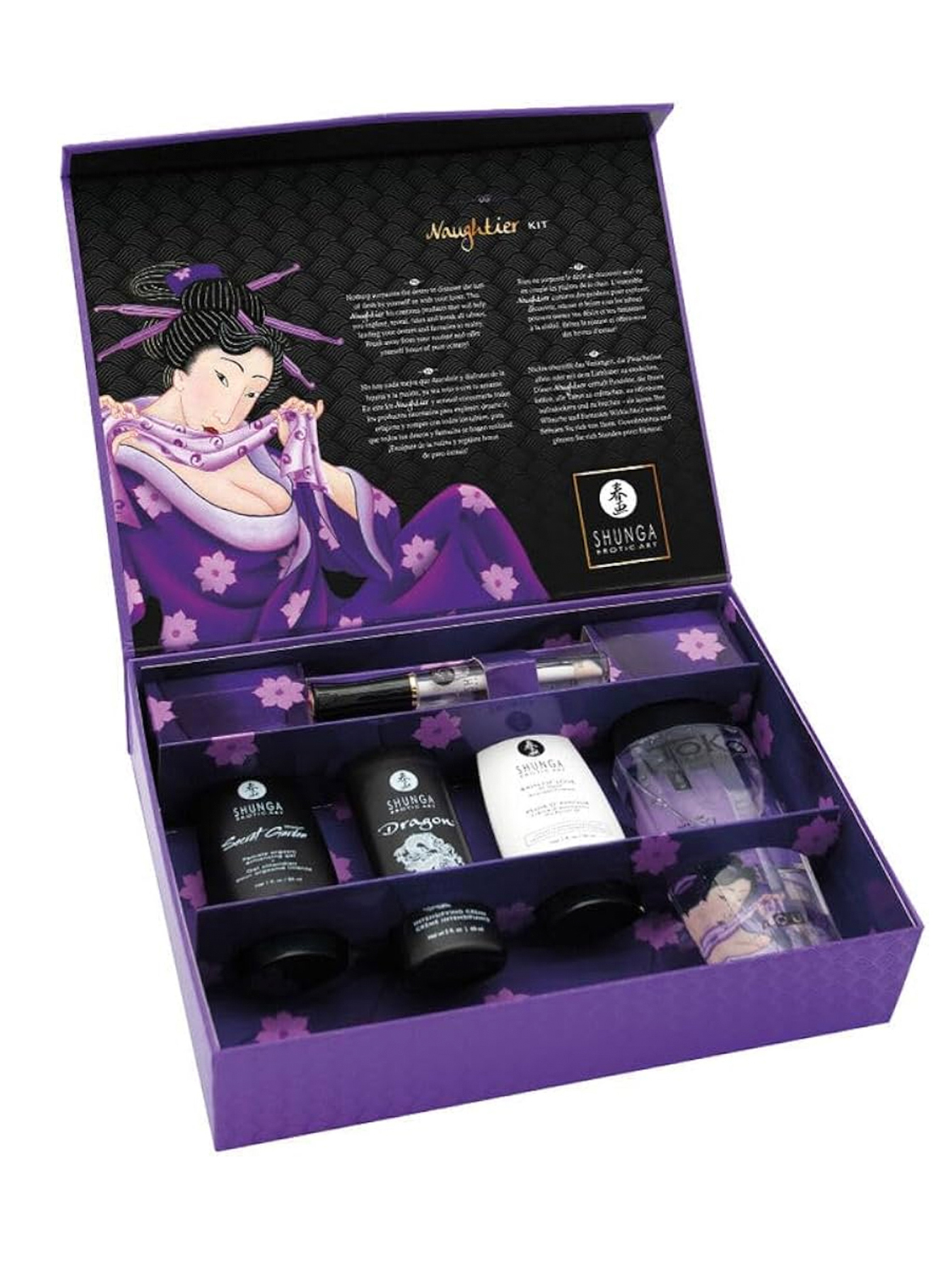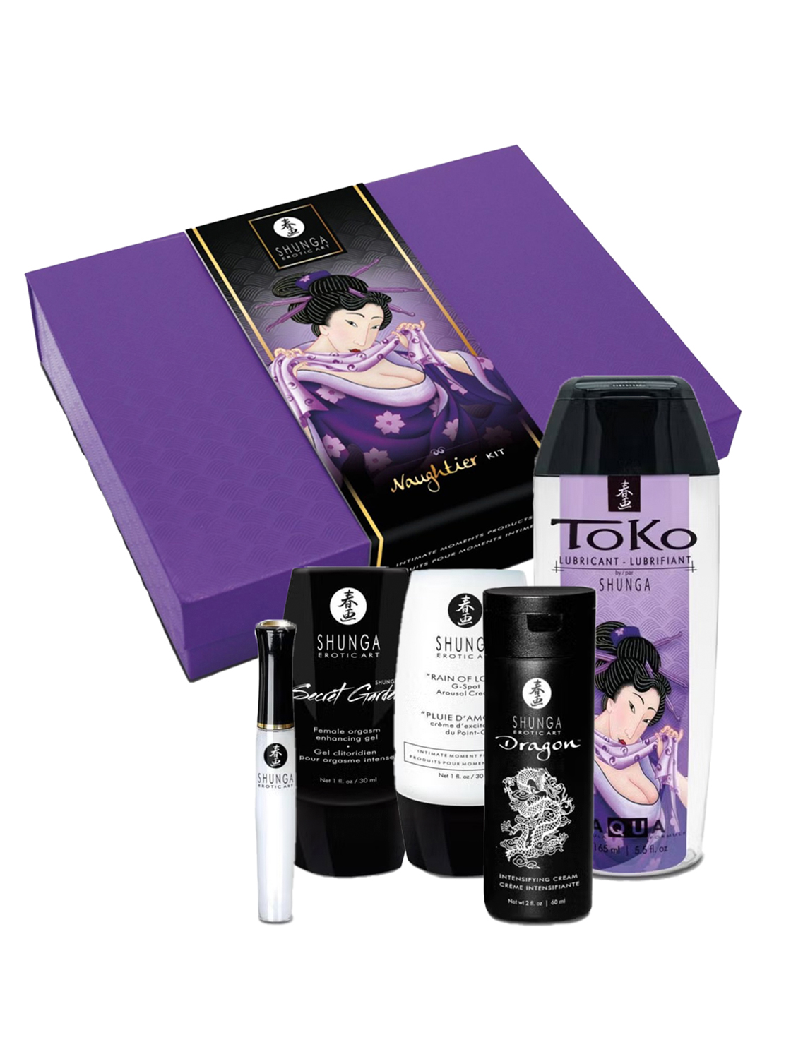 O Kit Naughtier de Shunga é um kit exclusivo que inclui cremes, lubrificante e gloss, projetado para fornecer os produtos essenciais que permitem o desfrute de diversas experiências sexuais.