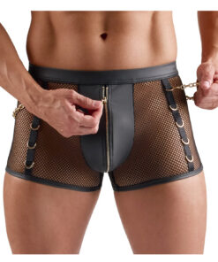 Fabricados numa mistura de rede, tecido de efeito molhado e argolas e correntes em metal dourado, este calções foram feitos para você se destacar em qualquer evento particular.