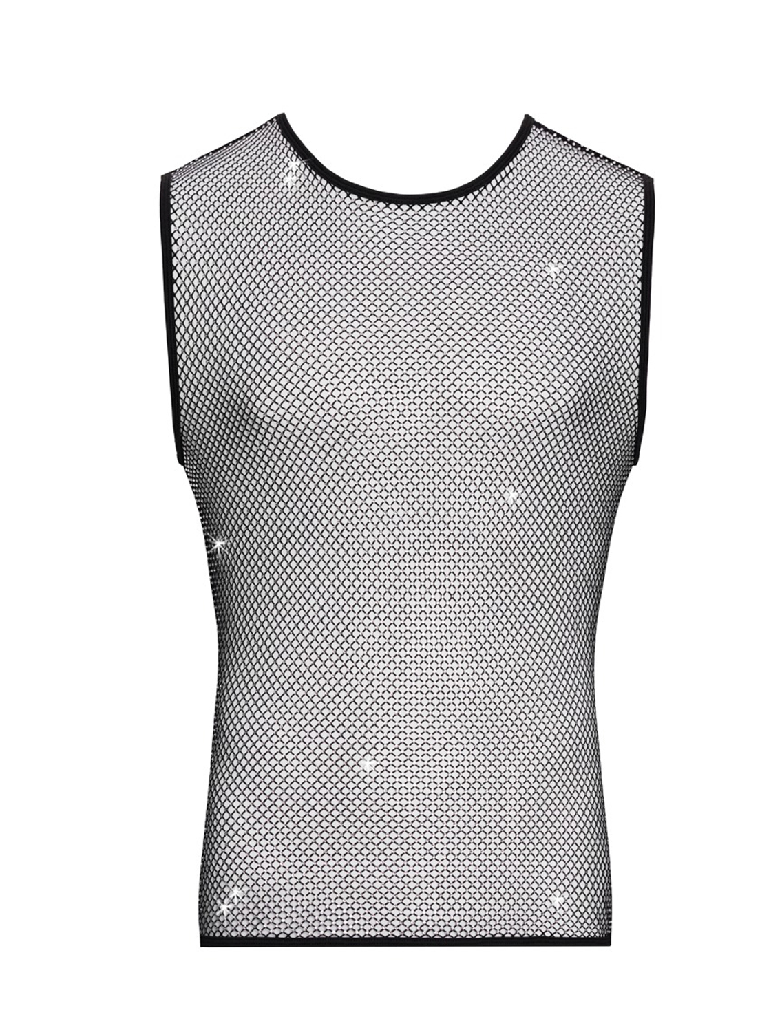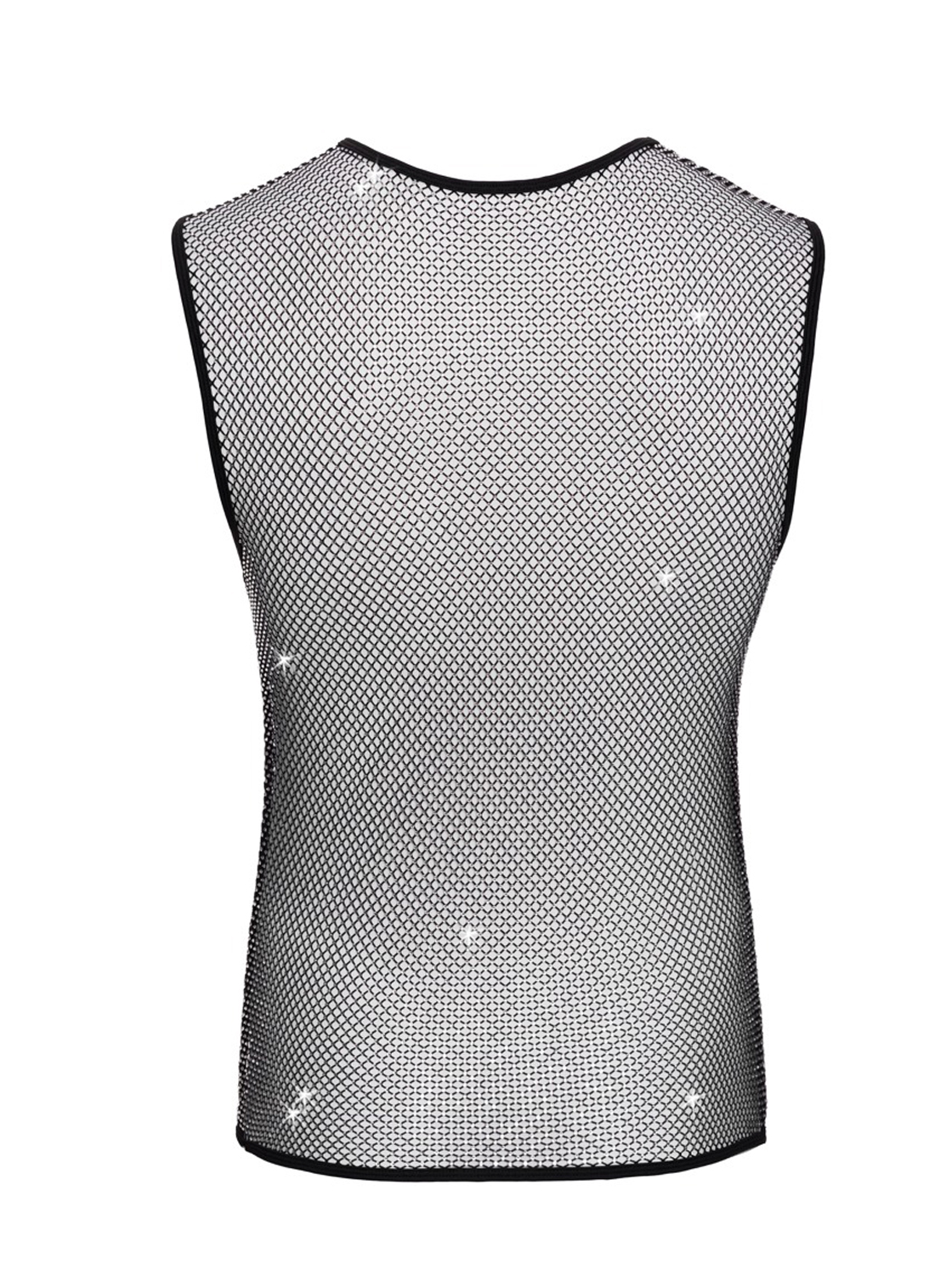 Seja o destaque em qualquer festa com esta blusa de alças de rede e pedras brilhantes.