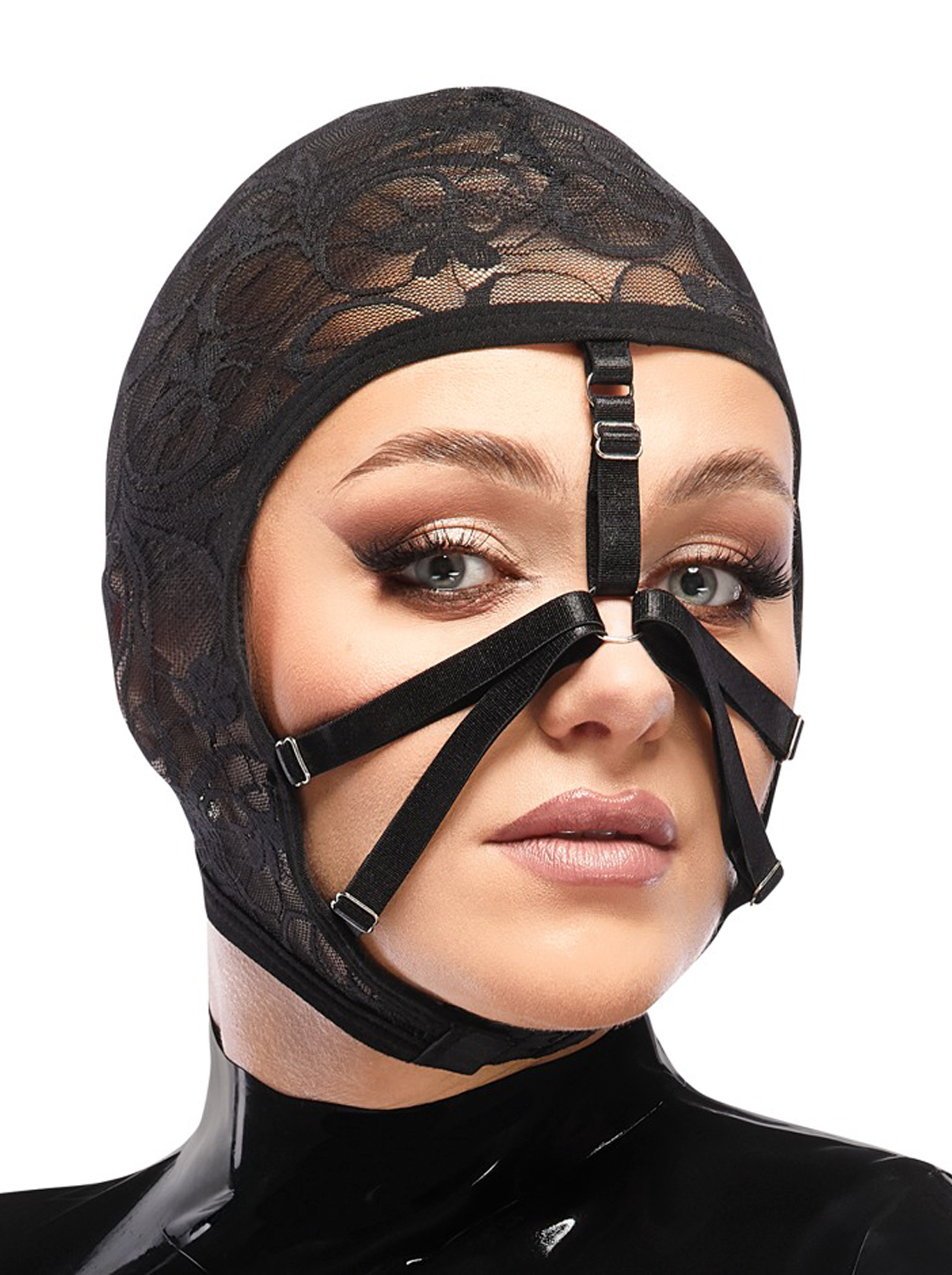 A máscara de cabeça da Bad Kitty combina a delicadeza da renda com um design intrigante, ideal para quem deseja adicionar um toque de mistério e estilo ao visual.