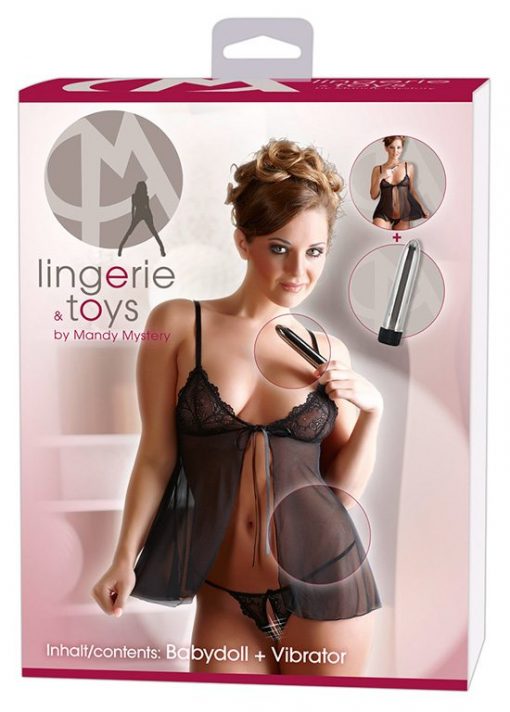 Conjunto de babydoll de tule e renda com abertura de colchete na frente e tanga fio dental a condizer, e um mini vibrador que funciona com uma pilhas AA, não incluída.