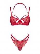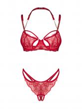 Desperte a paixão com este sofisticado conjunto de lingerie em renda vermelha. O soutien com armação realça a silhueta do peito, oferecendo suporte e valorizando as curvas femininas. A ousadia do decote é destacada por uma elegante alça para o pescoço, adornada com uma corrente dourada, criando um efeito sedutor e de requinte.