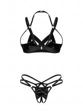 Este conjunto de lingerie em preto é confeccionado em tecido que imita látex, conferindo um ousado efeito wet-look. Combina estilo e funcionalidade para uma experiência única: