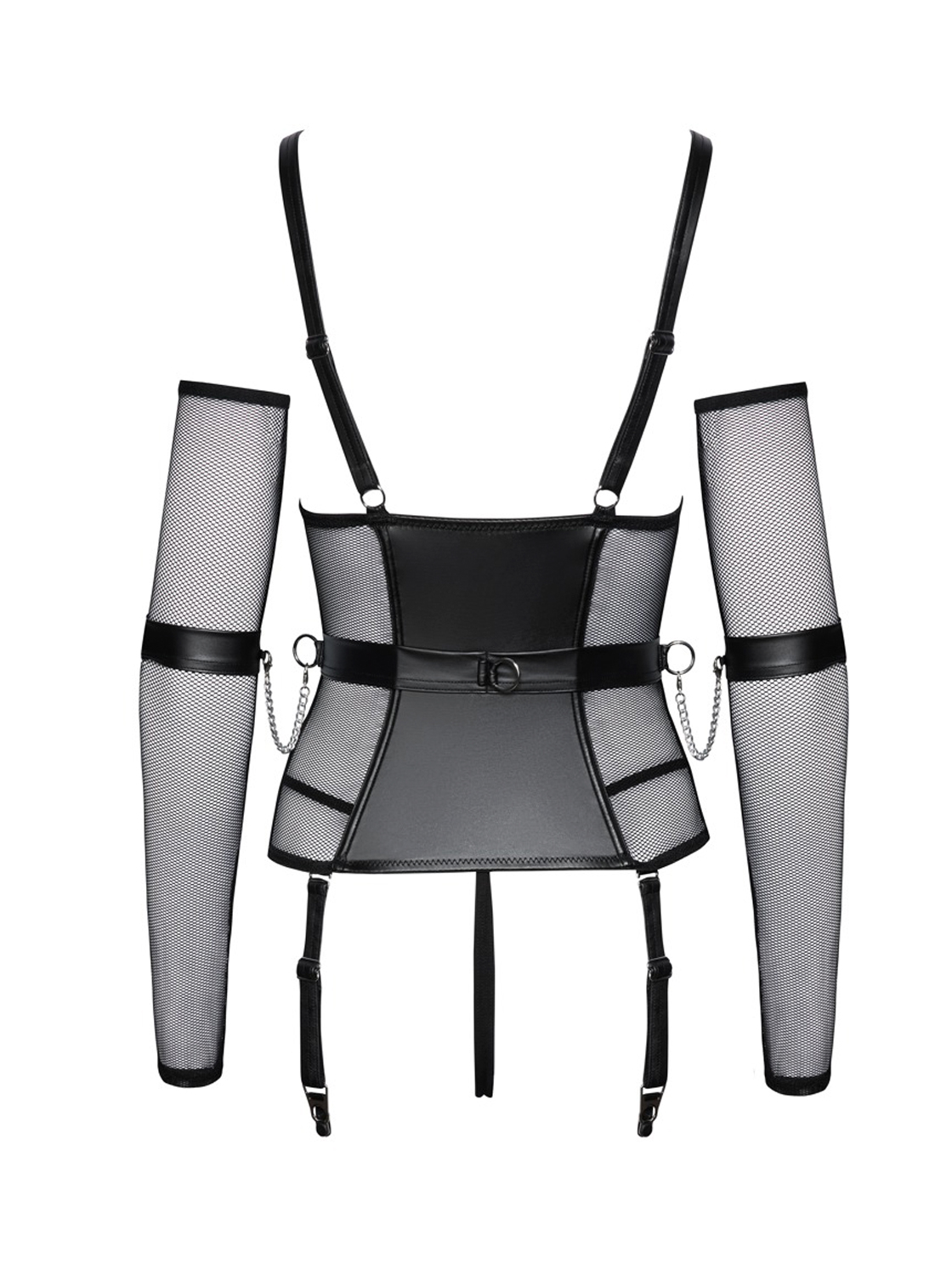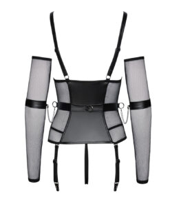 - Conjunto completo: Inclui um bustier, tanga com abertura na virilha, mangas longas em rede e restrições para os braços.