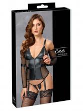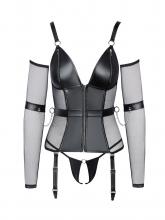 - Conjunto completo: Inclui um bustier, tanga com abertura na virilha, mangas longas em rede e restrições para os braços.