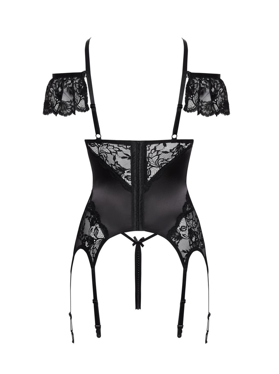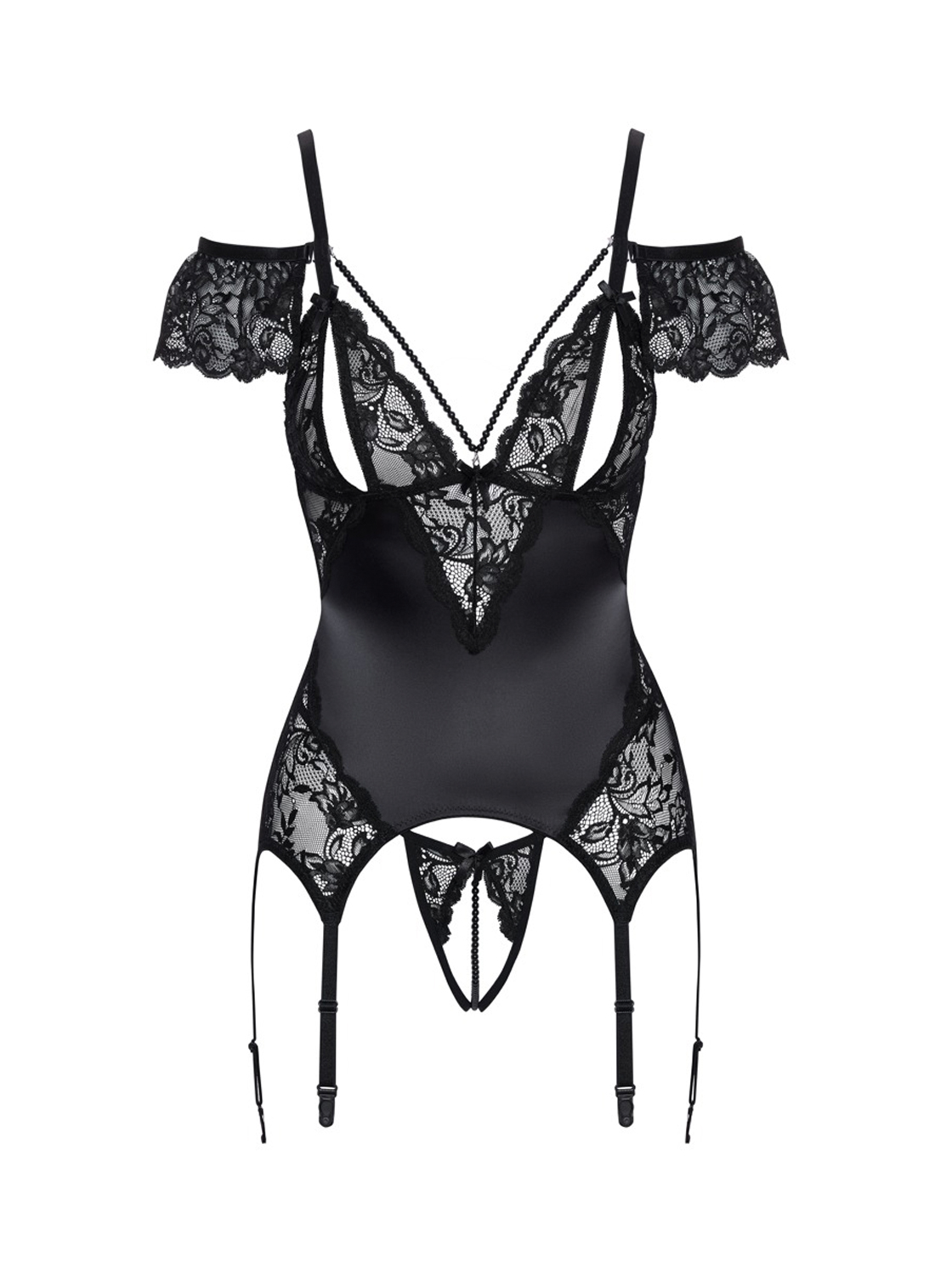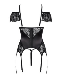 - Material preto com brilho acetinado, combinado com renda delicada.