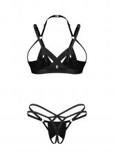 – Sexy conjunto rendado composto por soutien prateleira almofadado com suporte de arame de alças ajustáveis e fecho de colchetes, cinto de ligas com ligueiros ajustáveis e tanga com abertura na virilha.