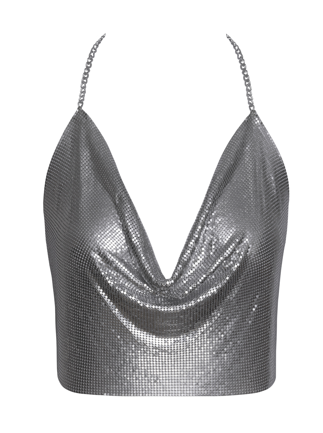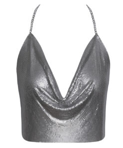 - Construção de Placas Metálicas Prateadas: Fabricado com pequenas placas metálicas prateadas brilhantes, este top oferece um brilho cintilante que reflete a luz de forma sofisticada, criando um efeito visual impressionante, e sente-se de forma extremamente sensual contra a pele.