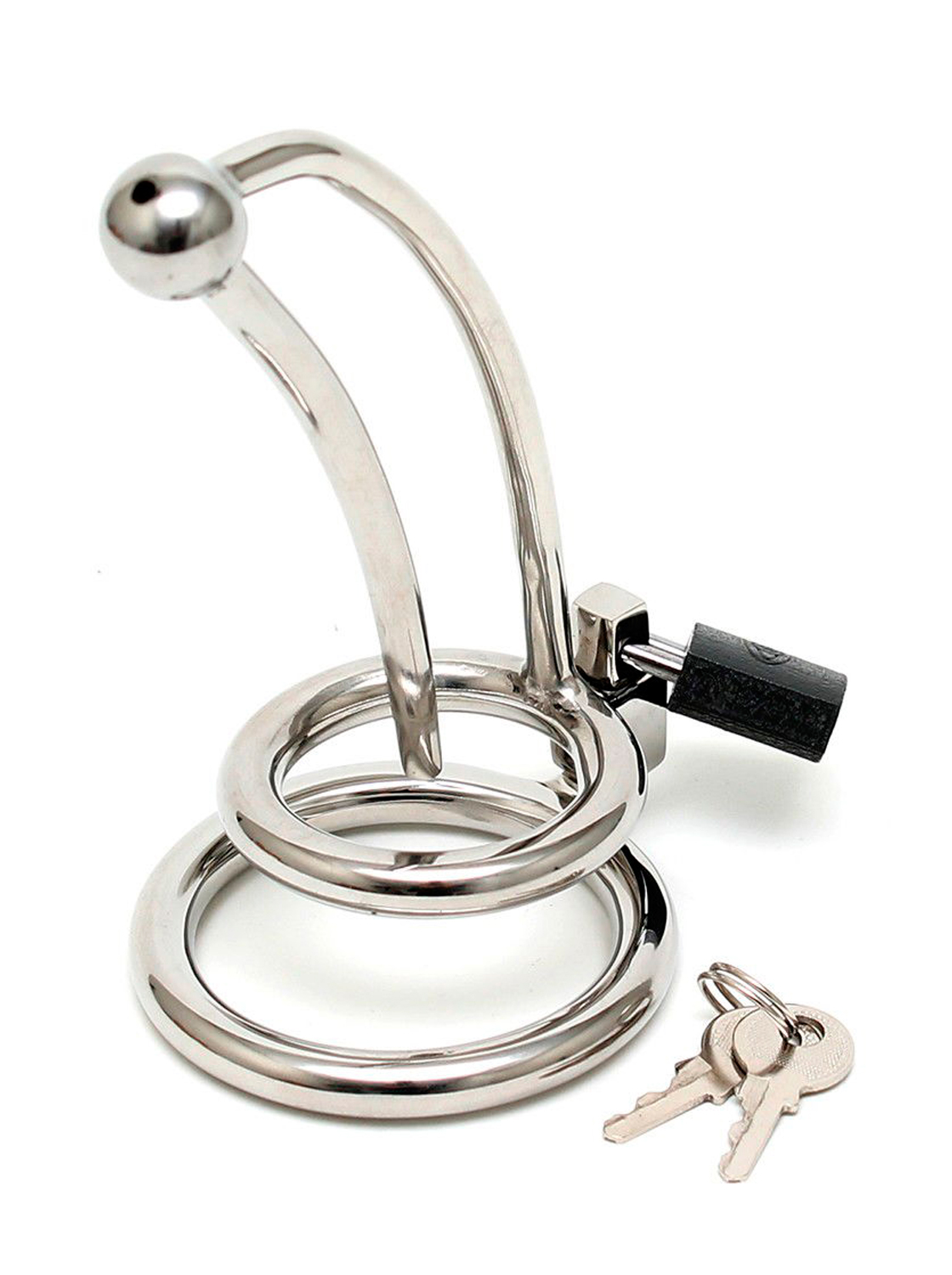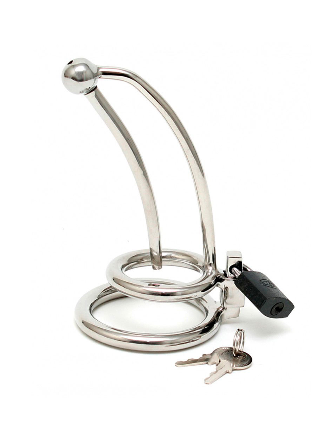Produzido em aço inoxidável, esta jaula é composta por duas peças. Uma base que fica por trás dos testículos, e a jaula com o plug uretral que é colocada por cima do pénis com o plug inserido, que por sua vez prende à base com um cadeado para garantir a castidade!