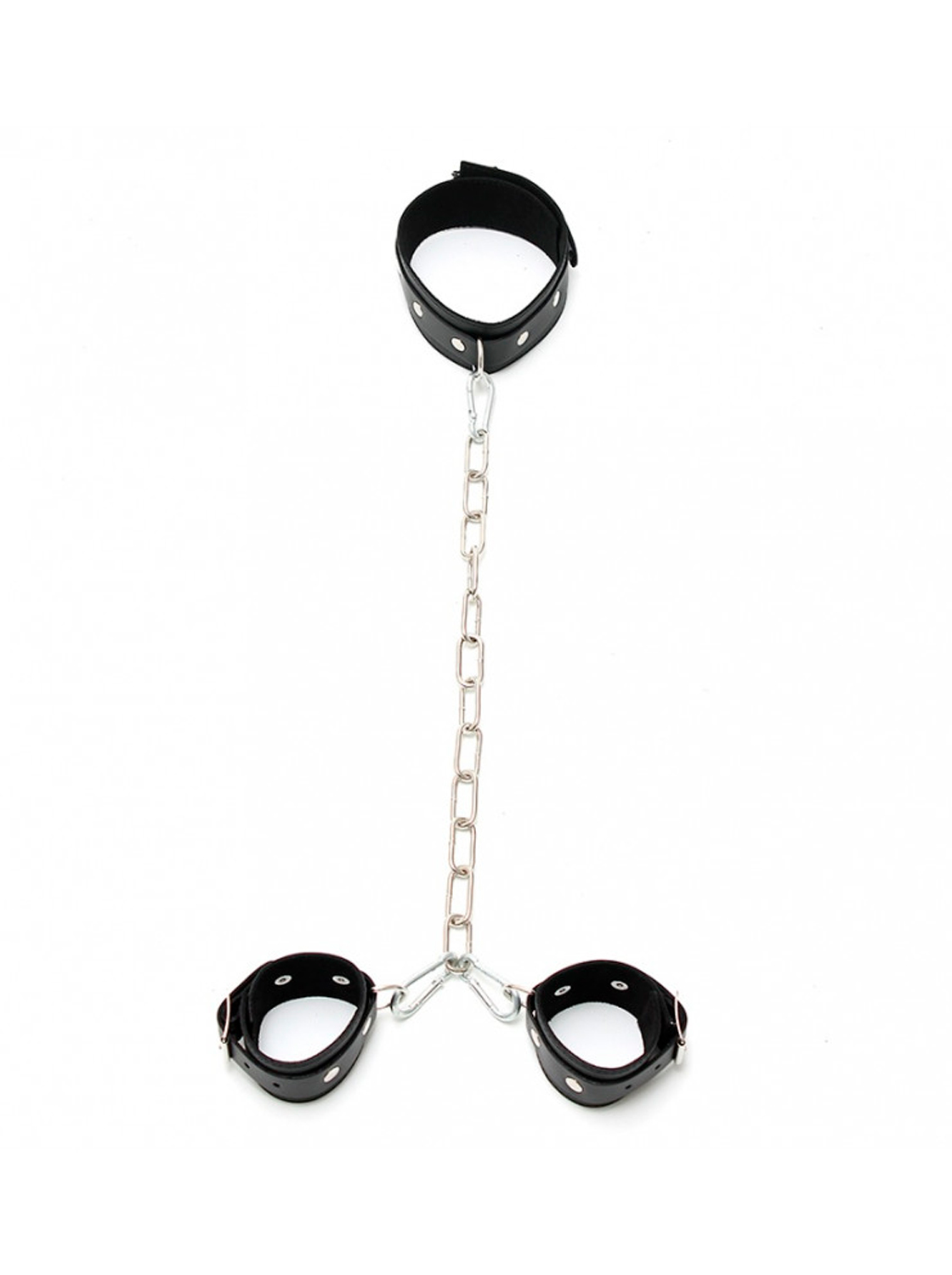 Este conjunto de cativeiro profissional é composto por duas algemas e um colar, todos fabricados em pele genuína e robusta com fivelas de ajuste.