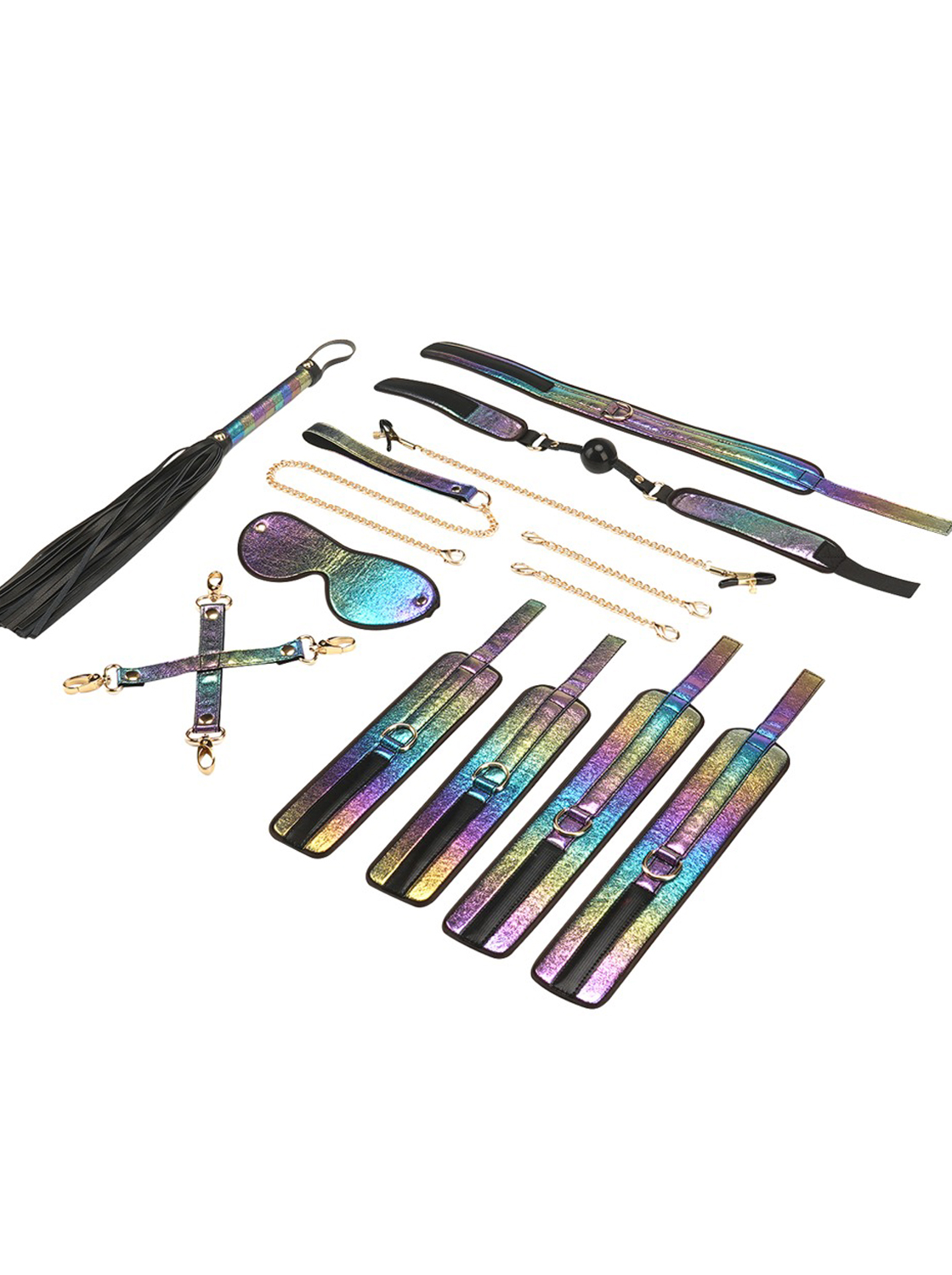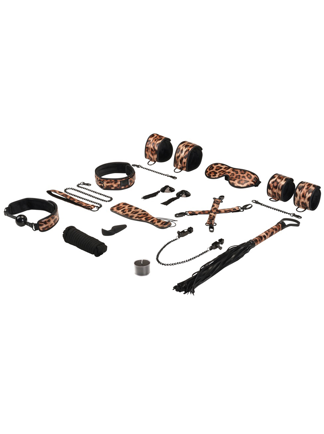 O conjunto de bondage de 13 peças, Leopard Print da Liebe Seele, apresenta um visual animalista de leopardo com detalhes e acessórios em metal preto. É um conjunto muito especial para casais curiosos e especialistas – exclusivo e de alta qualidade!