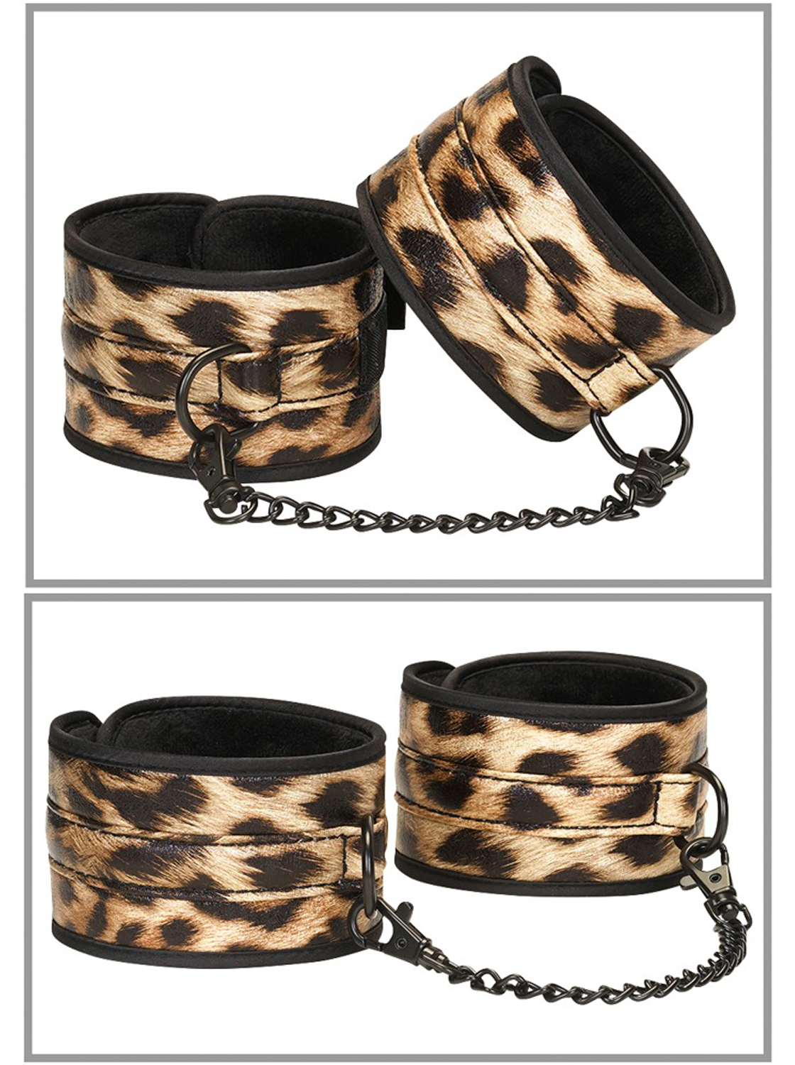 1 par de algemas de tornozelo. 6 cm de largura, 29,5 cm de comprimento (ajustável), corrente removível de 18 cm de comprimento.