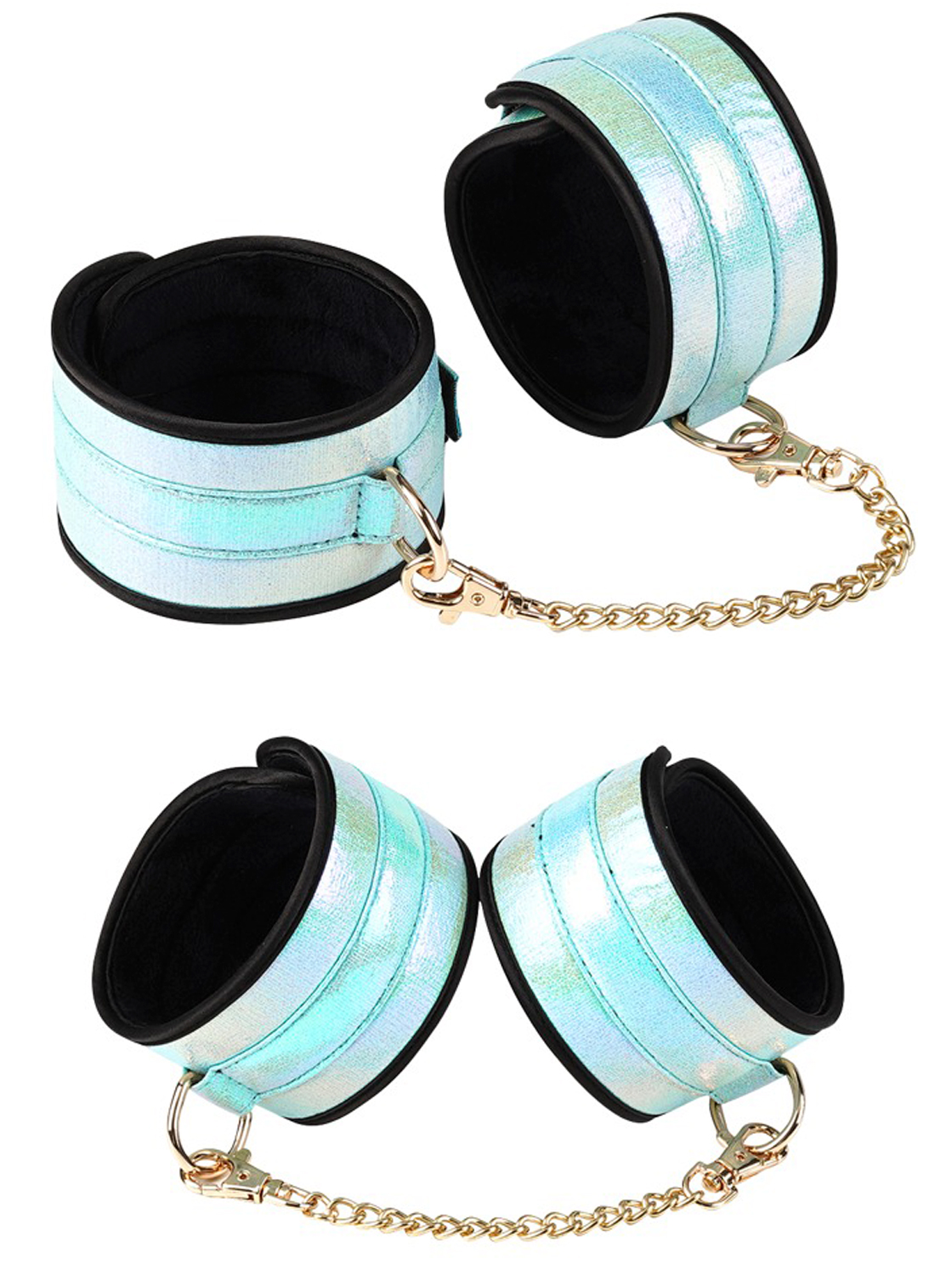1 par de algemas para tornozelo 6 cm de largura, 29,5 cm de comprimento (ajustável), corrente removível 16,5 cm de comprimento.