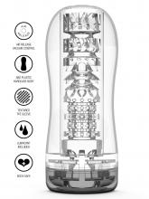Liberte o herói que há em si com este masturbador transparente com túnel apertado e repleto de nódulos, estrias e camaras de diferentes diâmetros que prometem massajar assertivamente o seu pénis até explodir de prazer!