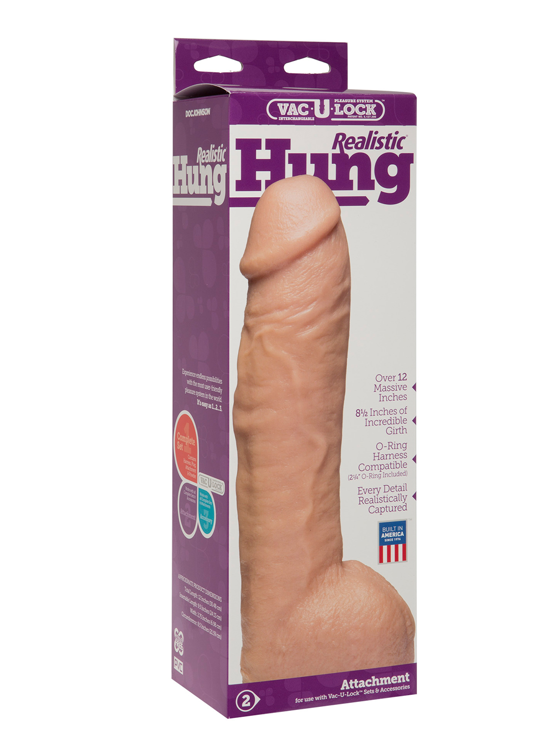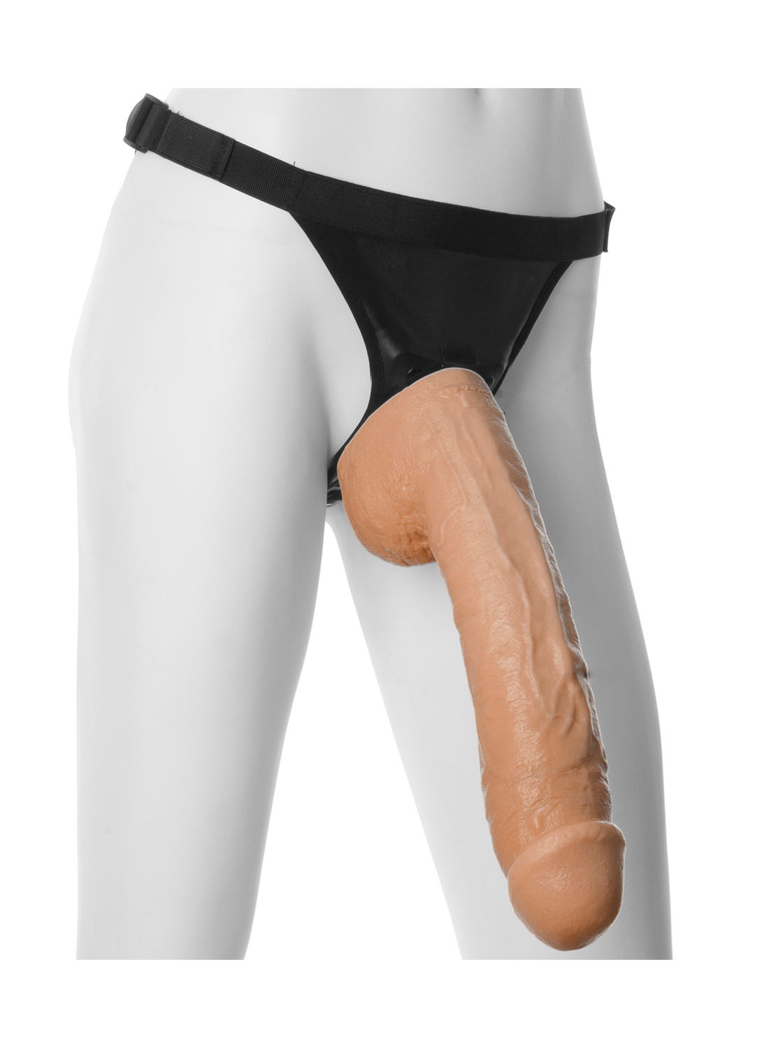 De formato realístico com veias e glande salientes, tem também testículos.
