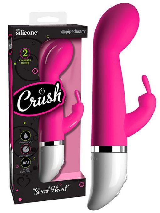 De estrutura ligeiramente flexível e cobertura de silicone suave e macia de elevada qualidade, o Crush Sweet Heart tem dois motores, um localizado na extremidade, e outro no estimulador de clítoris para uma sensação mais completa.