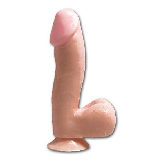 Fabricado em borracha, este dildo realístico da marca Basix tem a glande prenunciada e testículos para proporcionar maior prazer.